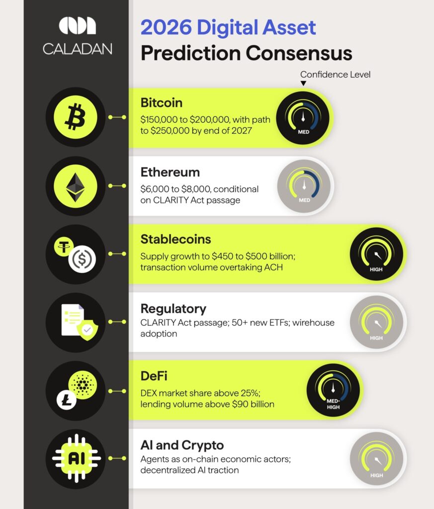 Regulatory predictions were the most accurate category in 2025, with institutions correctly calling the GENIUS Act, the Bitcoin Reserve executive order, SEC leadership changes, and the general shift toward a more constructive policy environment.