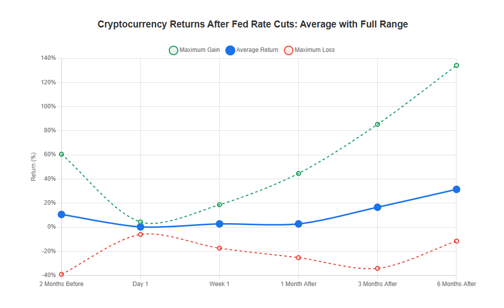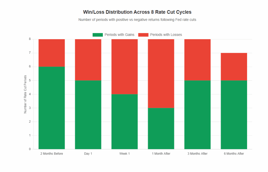 The data presents a clear verdict: Federal Reserve rate cuts do not guarantee immediate cryptocurrency gains. With only 37.5% of cuts producing positive returns within one month, the popular narrative of instant gratification proves false.
