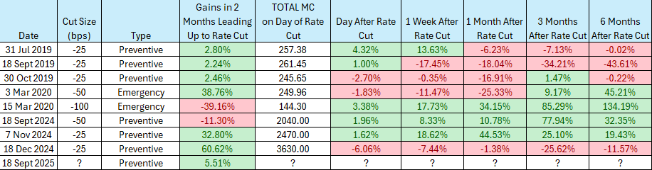 In contrast, the September 2025 setup differs markedly. Markets are down from mid-August highs rather than at extreme highs, and this would be the first cut of the year rather than the third.