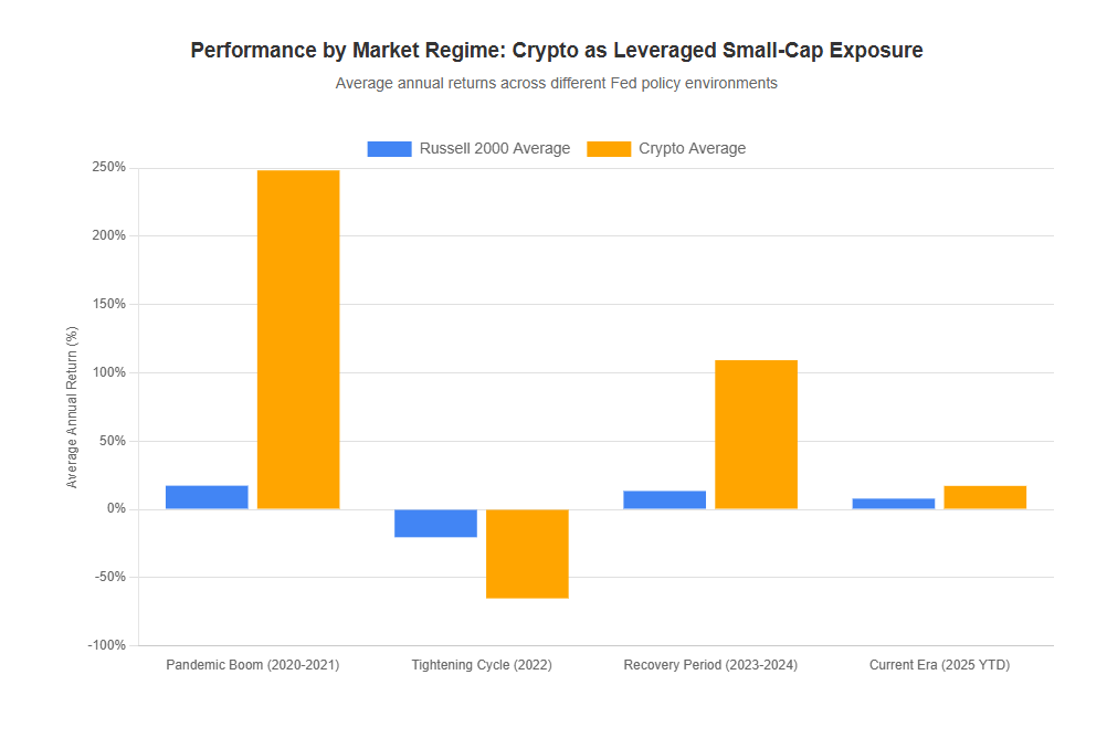 For investors, this means crypto provides minimal diversification benefit for small-cap portfolios, instead functioning as amplified exposure to the same macro drivers (Fed policy, liquidity conditions, and economic growth expectations).