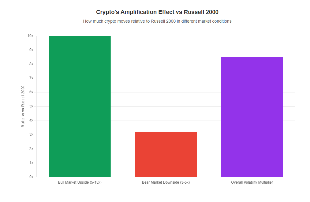 This high correlation demonstrates that cryptocurrency behaves as a mainstream risk asset moving in lockstep with small-cap equity markets, effectively acting as a highly leveraged Russell 2000 position with an 8.5x volatility multiplier.