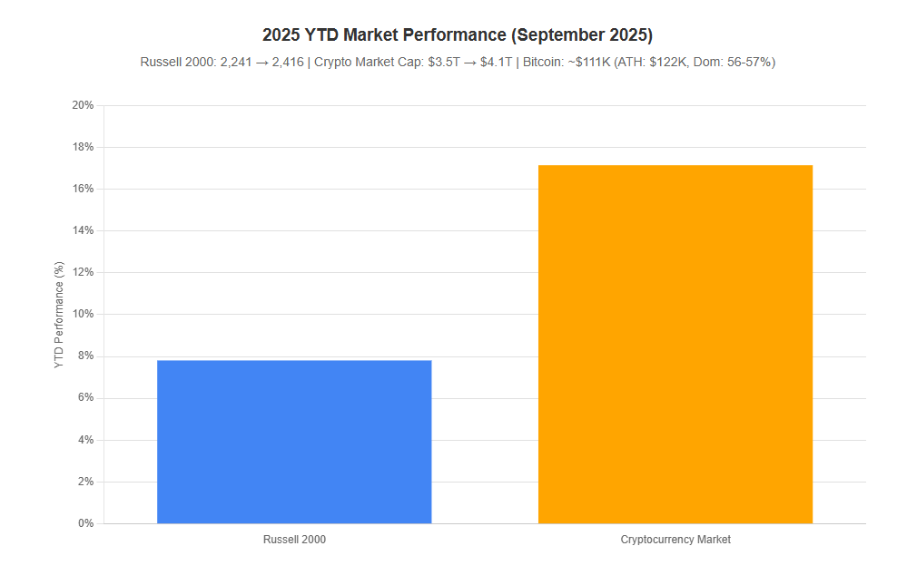 - In 2025 YTD, alignment continues with Russell up 7.81% (from 2,241 to 2,416) and crypto up 17.14% ($3.5T to $4.1T market cap), with Bitcoin trading around $111K after reaching highs near $122K and maintaining 56-57% dominance.